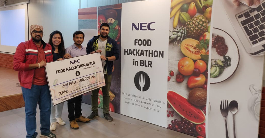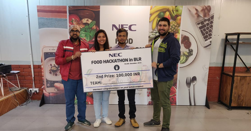 Team two-o-two secured 2nd position and won cash prize 100000 in the Hackathon, in NEC Food Hackathon organized by NEC Technologies in Bangalore, held on 7-8th December 2019. Team was shortlisted in first round on the basis of abstract submission out of 4500 teams and finally at venue we competedwith 30 teams.Participants were from different parts of country with various profile including students, Developers and other company professionals.