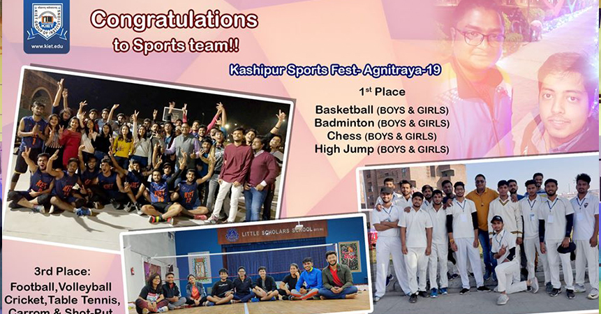 KIET Sports Team has performed tremendously in Kashipur Sports Fest- Agnitraya-19 held on 8-10 oct-2019. Our college participated in different events with teams like IIM KASHIPUR, IIM Lucknow, IIT Roorkee, IIT Kanpur, College Of technology Pantnagar, JERC JAIPUR, IIT BHU, FMS BHU, JAYPEE NOIDA, etc.