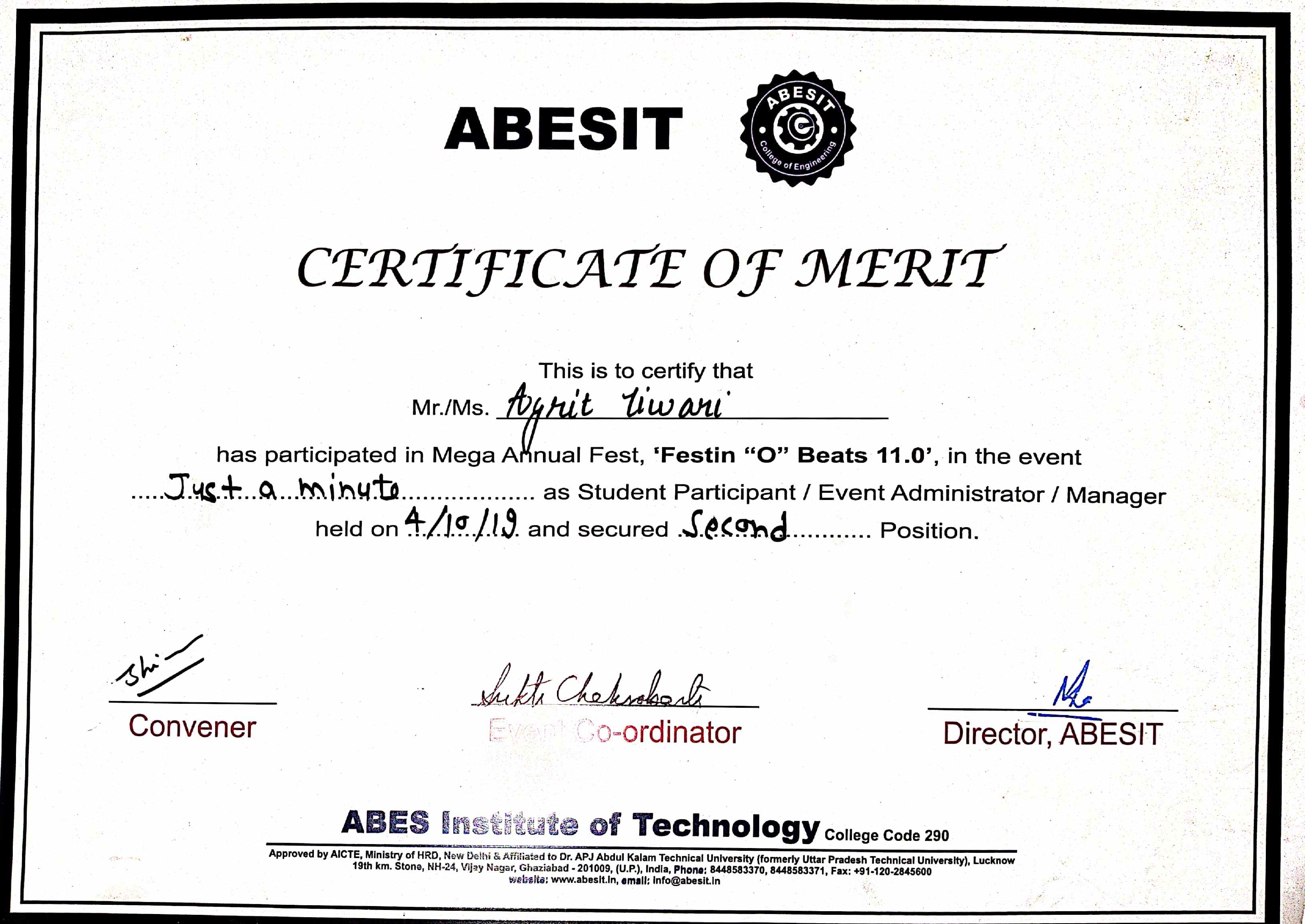 Arpit Tiwari have secured 2nd position in event JUST-A-MINUTE (JAM) during a technical Fest “FESTIN-O- BEATS” organized by ABESIT Ghaziabad on 3rd & 4TH Oct 2019.