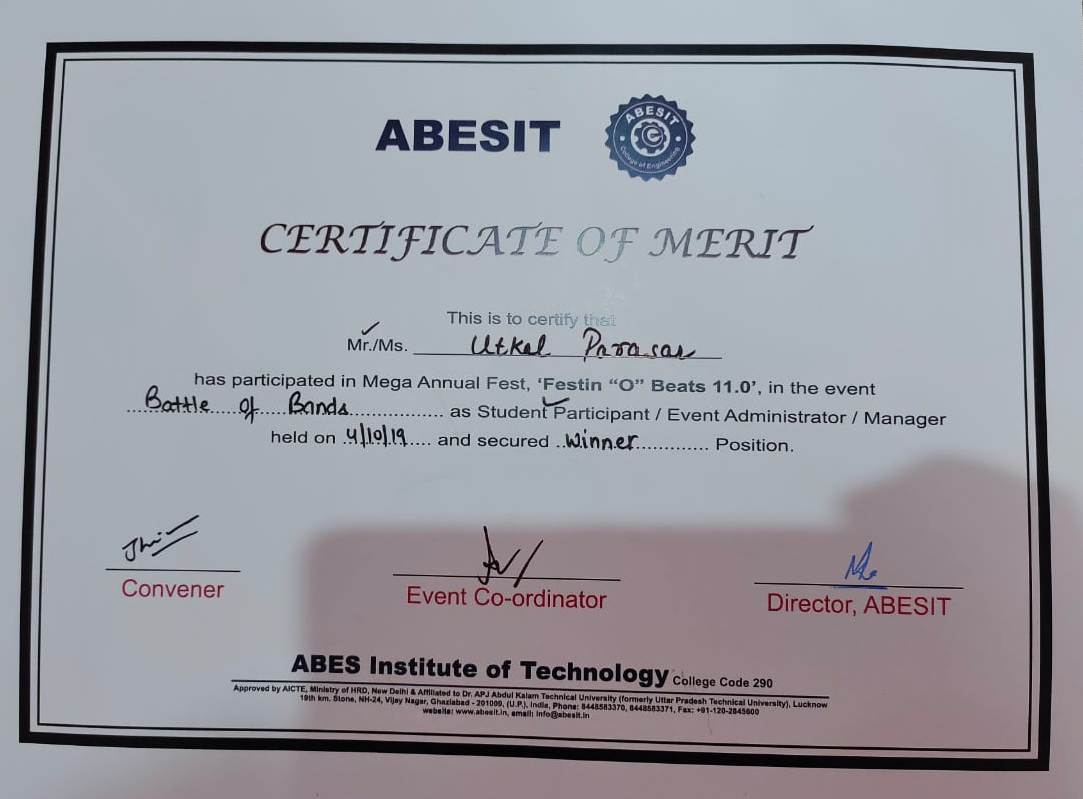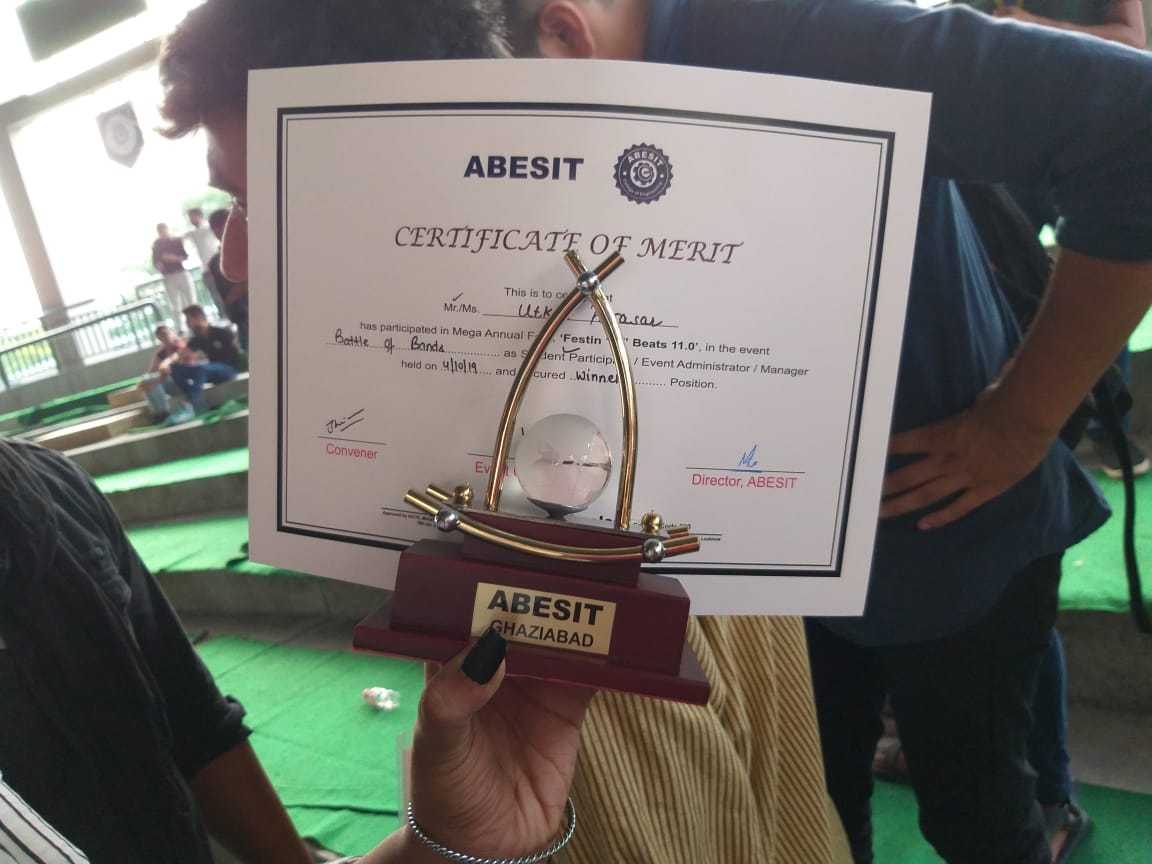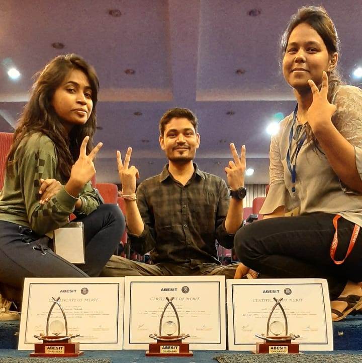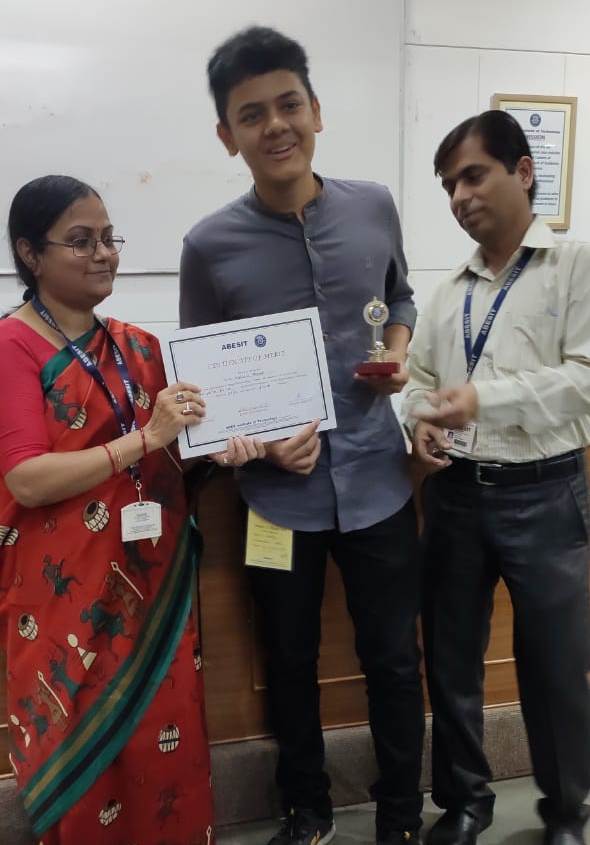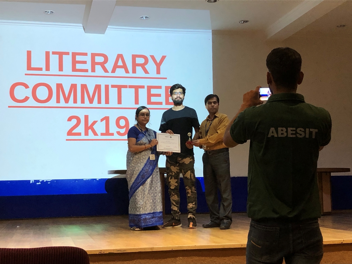 Students who stood winners in different events in ABESIT are: •Parv Kumar Vishwakarma (ME-3rd year, Section-C) -Poetry Writing •Kshitiz Mankoti(EN,3rd Year,Section-B)-How Positive You Can be? •Apurva Singh(ECE,2nd year,Section-A)-Creative Writing •Kinshuk Agarwal(CSE,2nd year,Section-B)-JAM