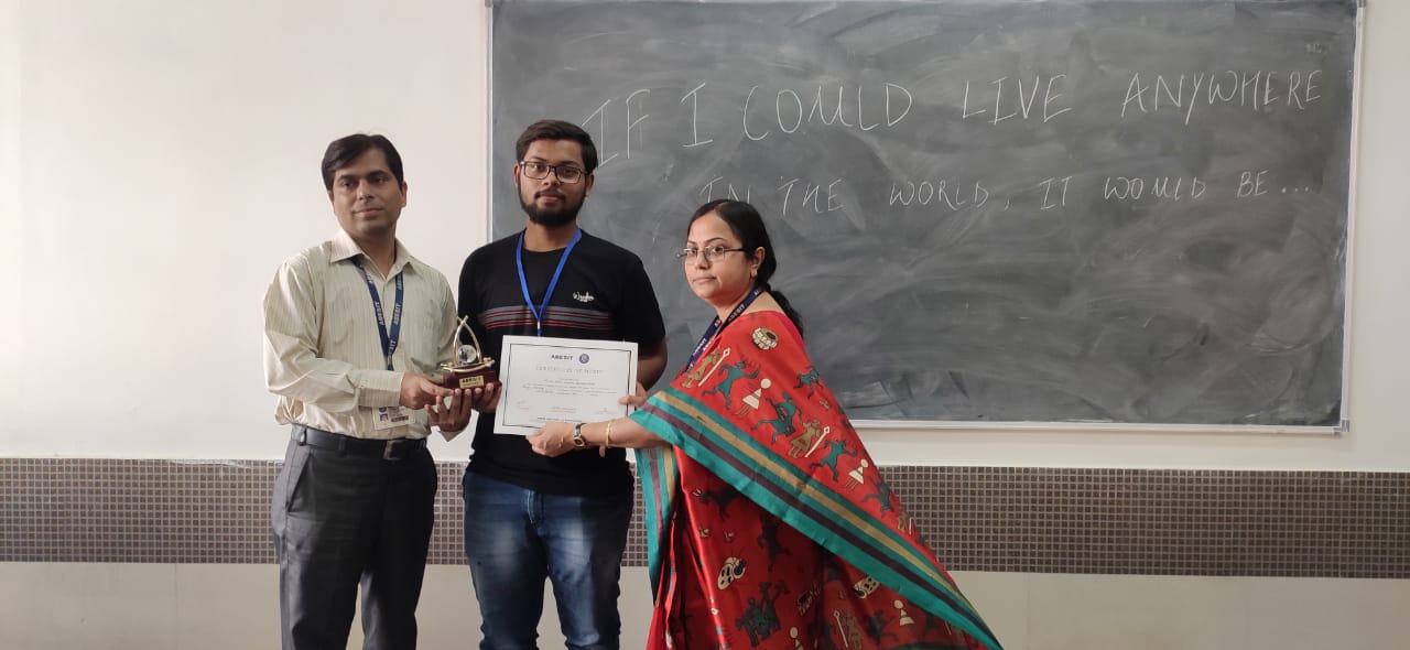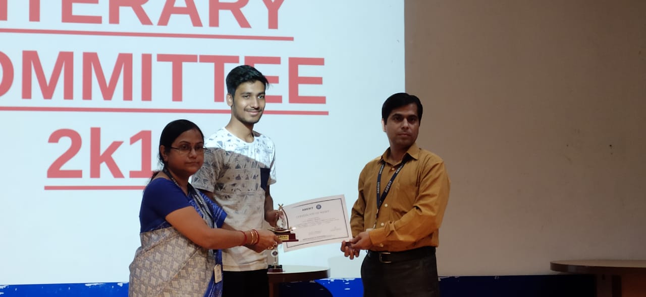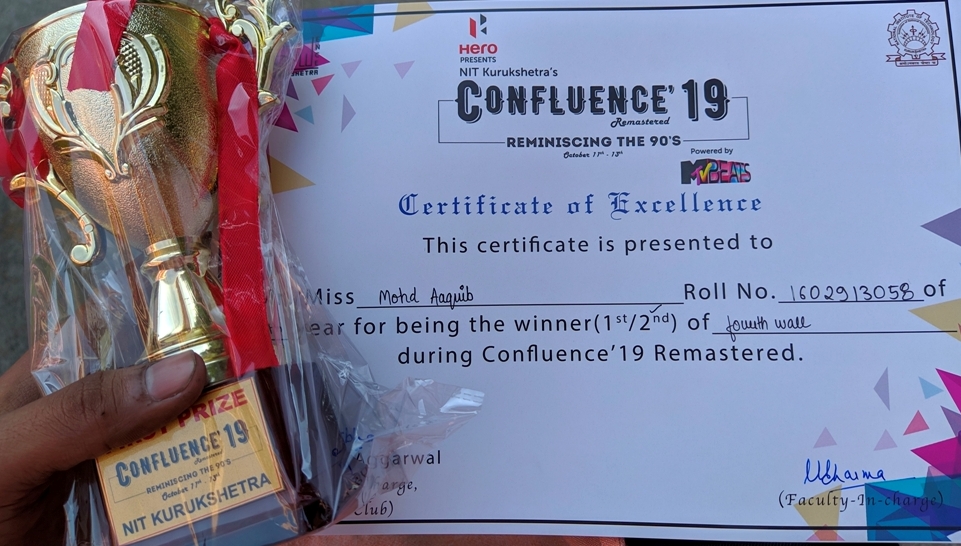 Mohd Aaquib of I.T. Department. 4th Year won 2nd Prize at NIT Kurukshetra in Monodrama Competition. He received a Trophy & Certificate of excellence . This was a solo acting competition in which competition is on the basis of expression, storyline, acting skills and clarity of words and creativity.