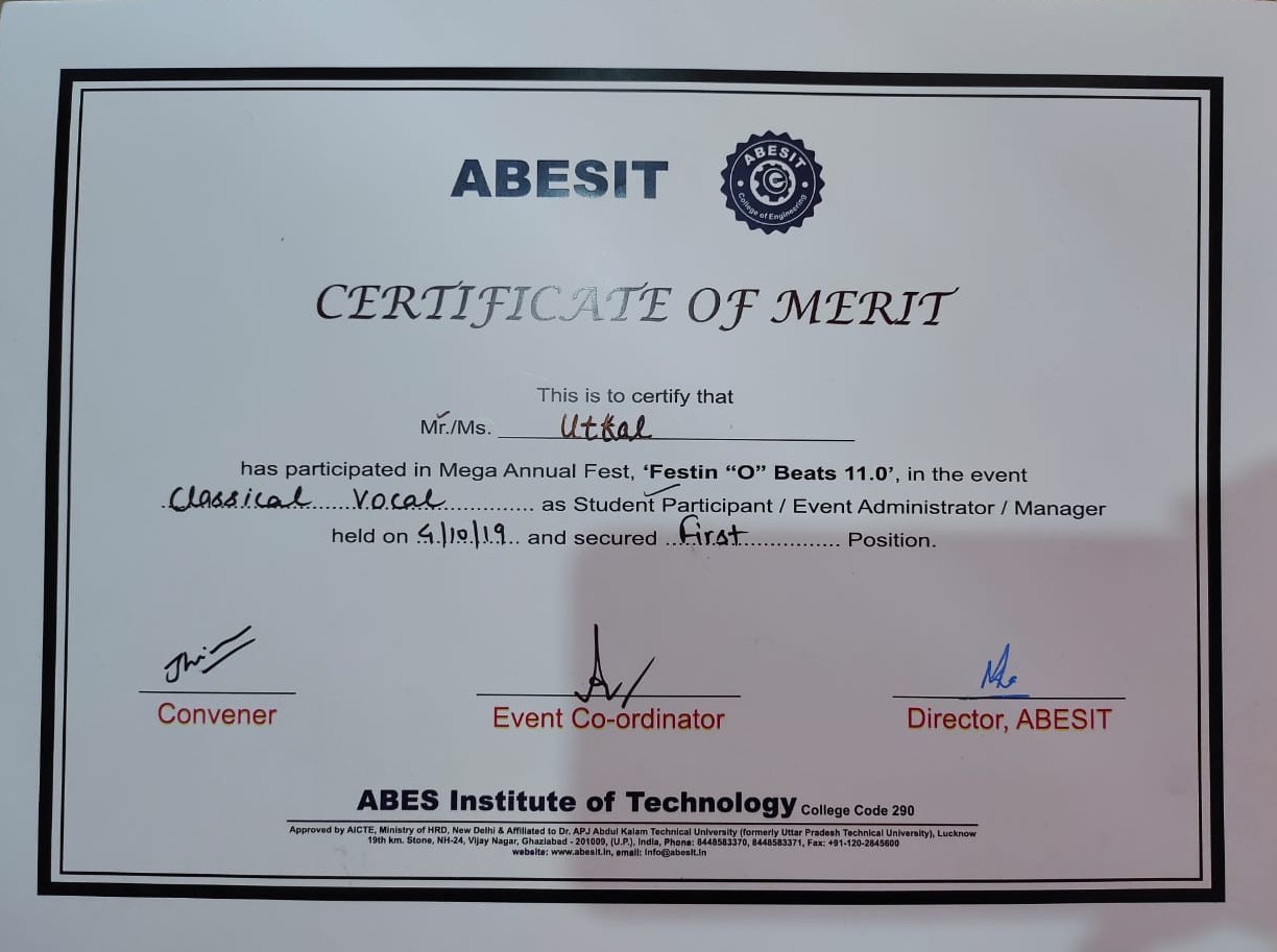 A Student from IT Department have secured 1st position in event “Technical Quiz” during a technical Fest “FESTIN-O- BEATS” organized by ABESIT Ghaziabad on 3rd Oct 2019.