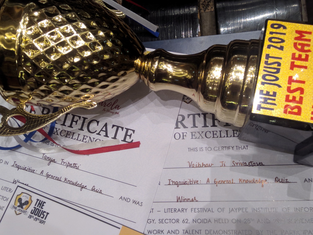 Team Quizzinga secured FIRST position in the INQUIZITIVE - The GENERAL QUIZ organized by Parola - The Literary Hub of JIIT, is the annual literary festival of Jaypee Institute of Information Technology.