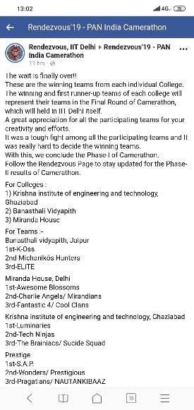 Aayushi Srivastava and Aman kansal with their team members Siddhant gupta, Archit Mittal and Aadarsh Singh student of IT department achieved first position among all colleges in India and got cash prize of Rs5000, in “camerathon” organized on 20th September 2019 in college campus as an pre-qualifying round for treasure hunt at Rendenvous-19 cultural fest of IIT Delhi by their campus ambassador.