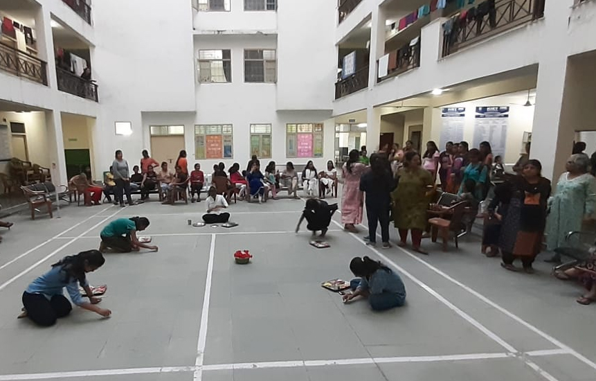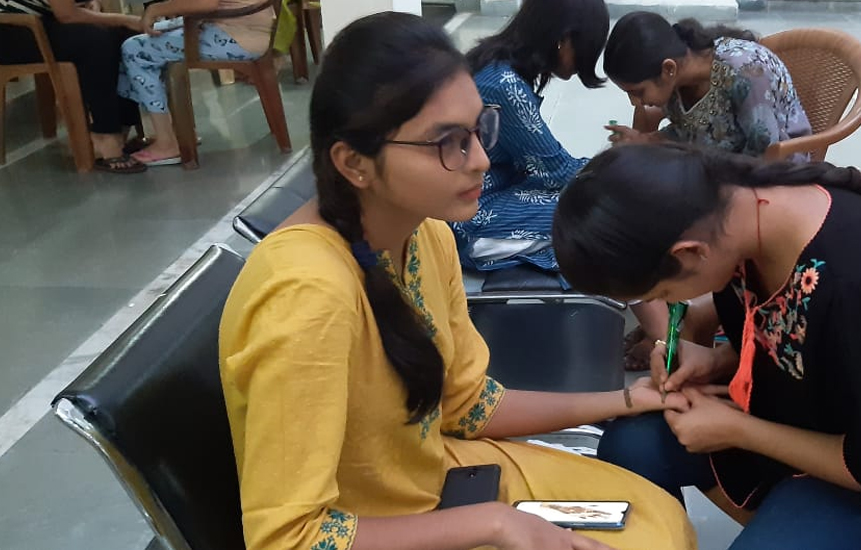 On 16th October a program of Mehandi and Rangoli competition was organised for the residents of Gargi Hostel to bring the homely festive environment and to increase the intimacy and bonding among them. 16 girls participated in Mehandi and 5 Girls in Rangoli competition. The other residents of Gargi hostel were also the part of this festive evening. Filled with energy and enthusiasm they were cheering and encouraging the participants. Meanwhile the participants were showing their talents.