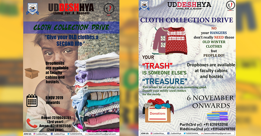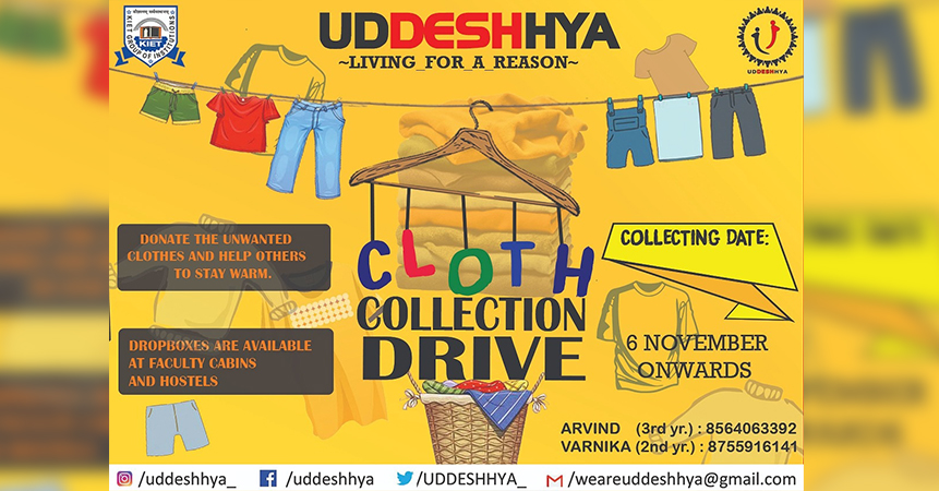 “When we give cheerfully and accept gratefully, everyone is blessed.” Team UDDESHHYA, the social welfare group of KIET running a Cloth Collection Drive 2019 from 6 November to 15th November, 2019. Items that can be donated: • Warm clothes (new or old in good condition) of all age groups. • Sweaters, shawls, socks, woolen caps, scarfs, and innerwear etc.