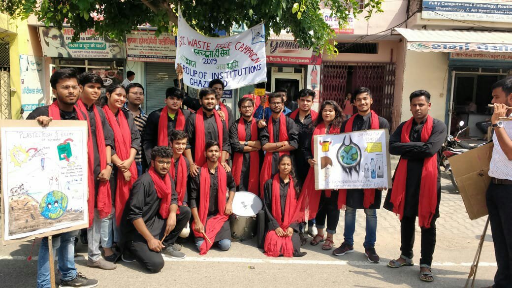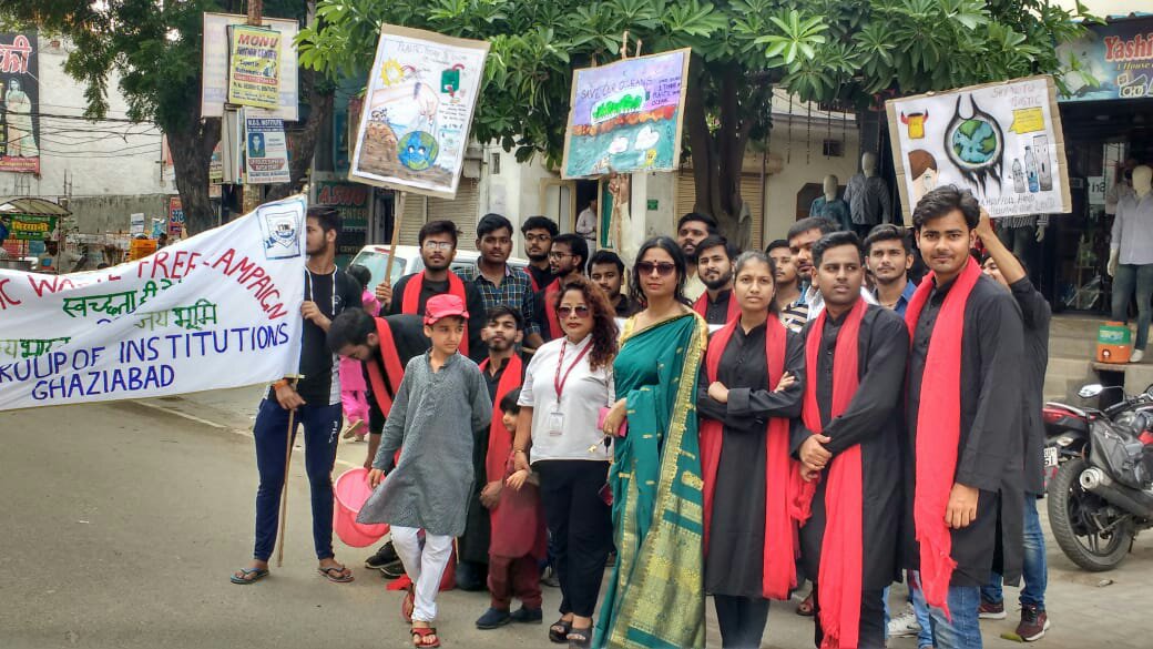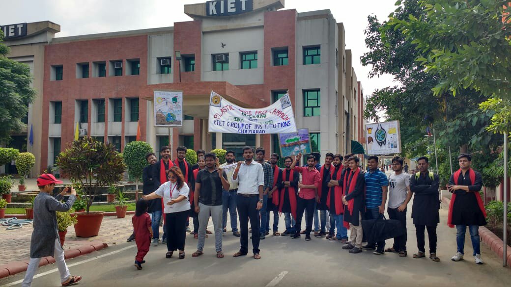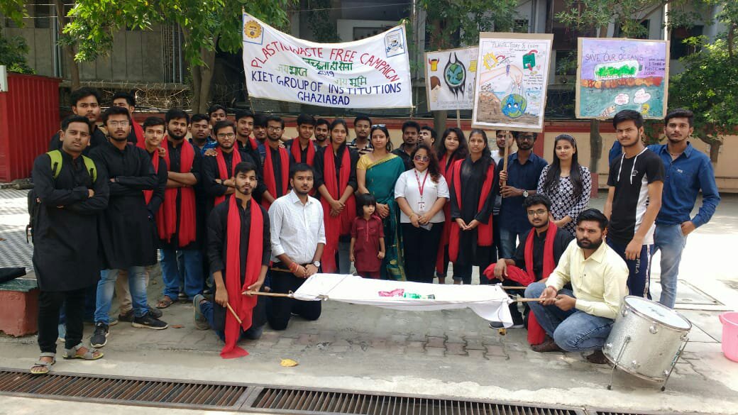 The Team "Jai Bharat Jai Bhoomi" was miraculously leaded by environmentalist Ms Meenakshi Karwal, with immense support from the management of the KIET Group of Institutions, Dr. (Col.) A. Garg, Joint Director Dr. Manoj Goel and Dean (Student Welfare) Dr. Ashish Karnwal on 2.10.2019 on the auspicious occasion of Gandhi Jayanti. “Cleanliness is service” message was spread among Peoples. Audience was made aware and urged not to use plastic. Team took out the plastic bier and conveyed a strong message to the peoples. Plastic biers were taken out from KIET Group of Institutions to Railway Road Muradnagar with banners and posters filled with the messages. Rally was taken out on the entire railway road shouting slogans related to plastic side effects and environmental damage. People were informed about the damage done to the environment by plastic by organizing a street theatre on the railway road itself. Honorable Prime Minister of our country, Shri Narendra Modi has informed the world about the damage caused by plastic to the environment and is urging everyone to stop using plastic so that the environment could be pure and clean.