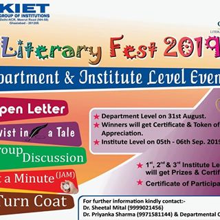 Odyssey- The Literary Society of KIET organized Literary Fest 2k19 at Department Level on 30th-31st August and Institute Level on 5-6 September. More than 1500, Students have participate in various activities like, Twist in a tale, open letter, JAM – English, JAM – Hindi, Group Discussion and Turn Coat
