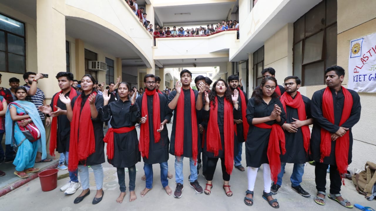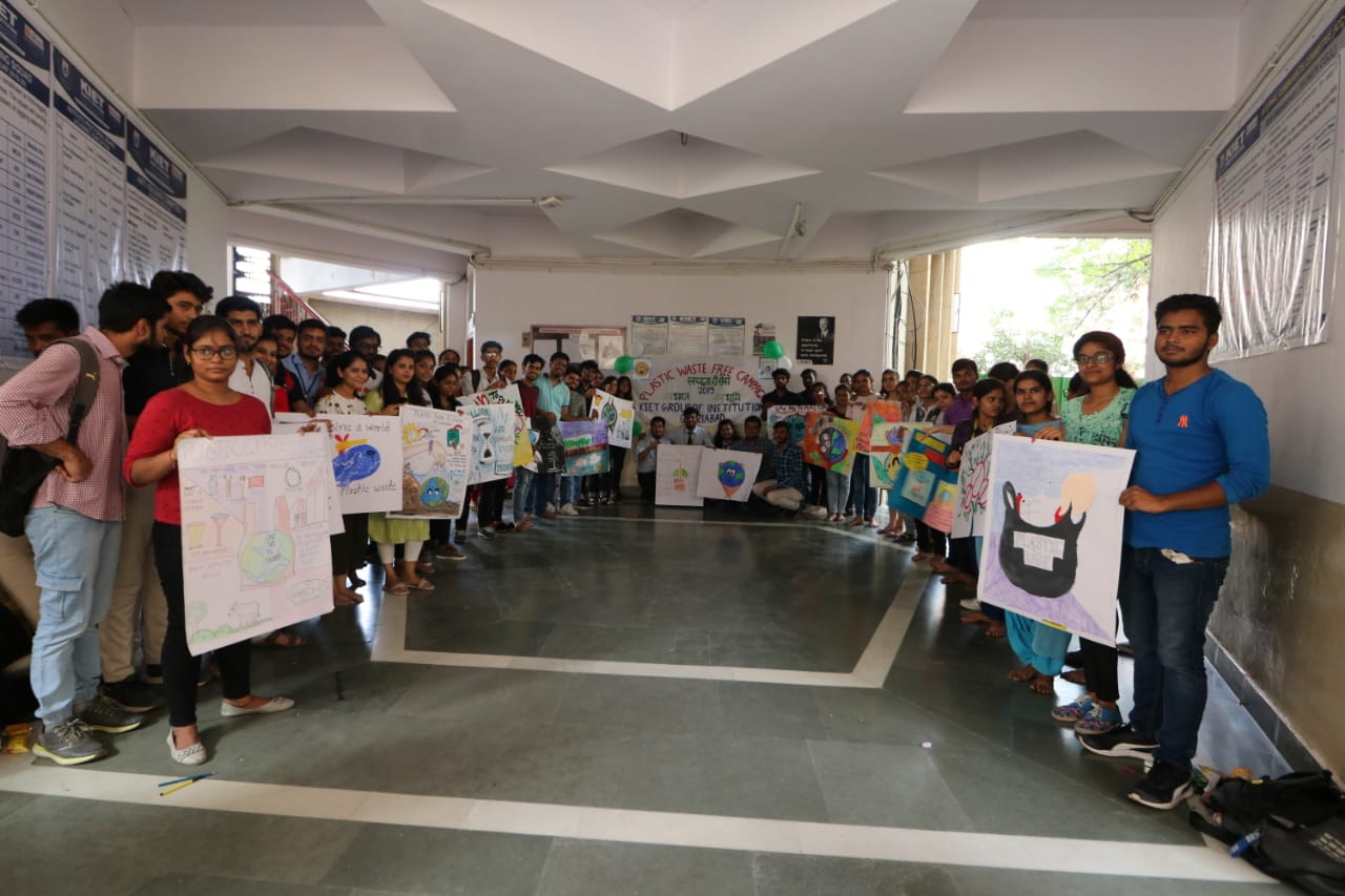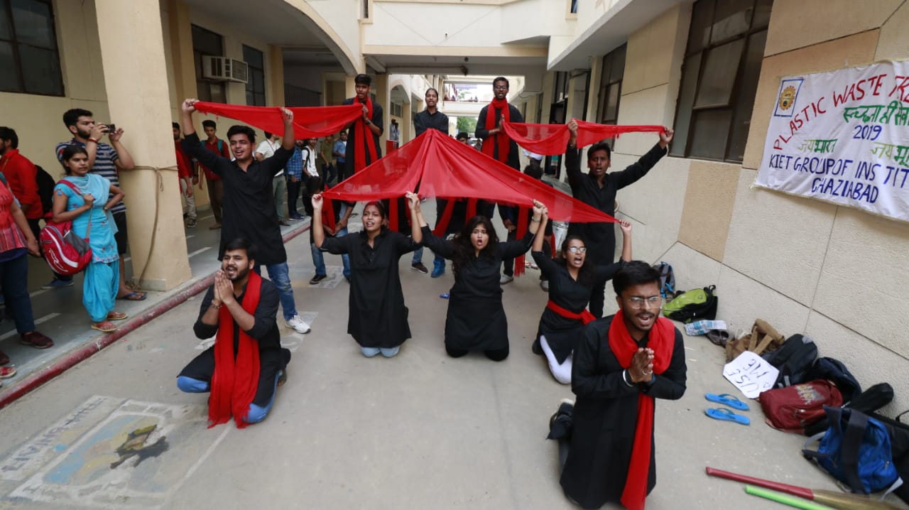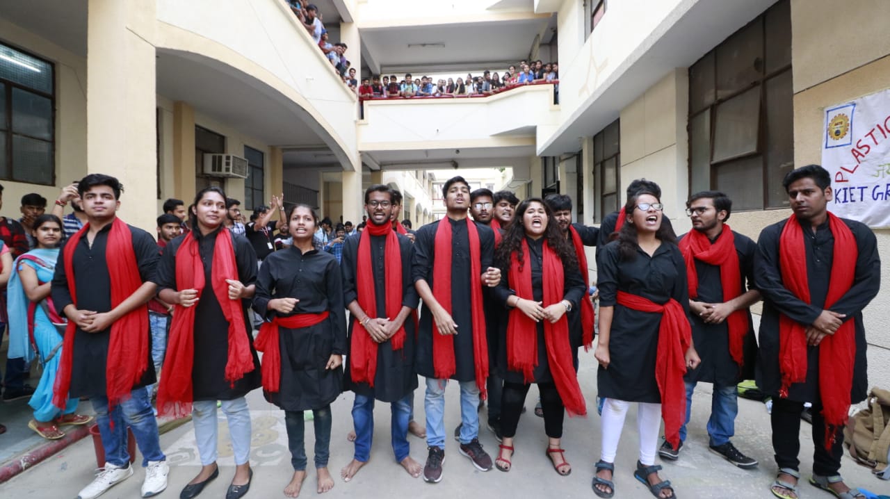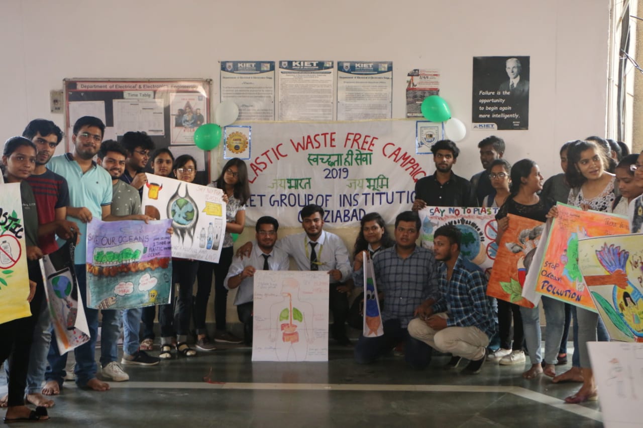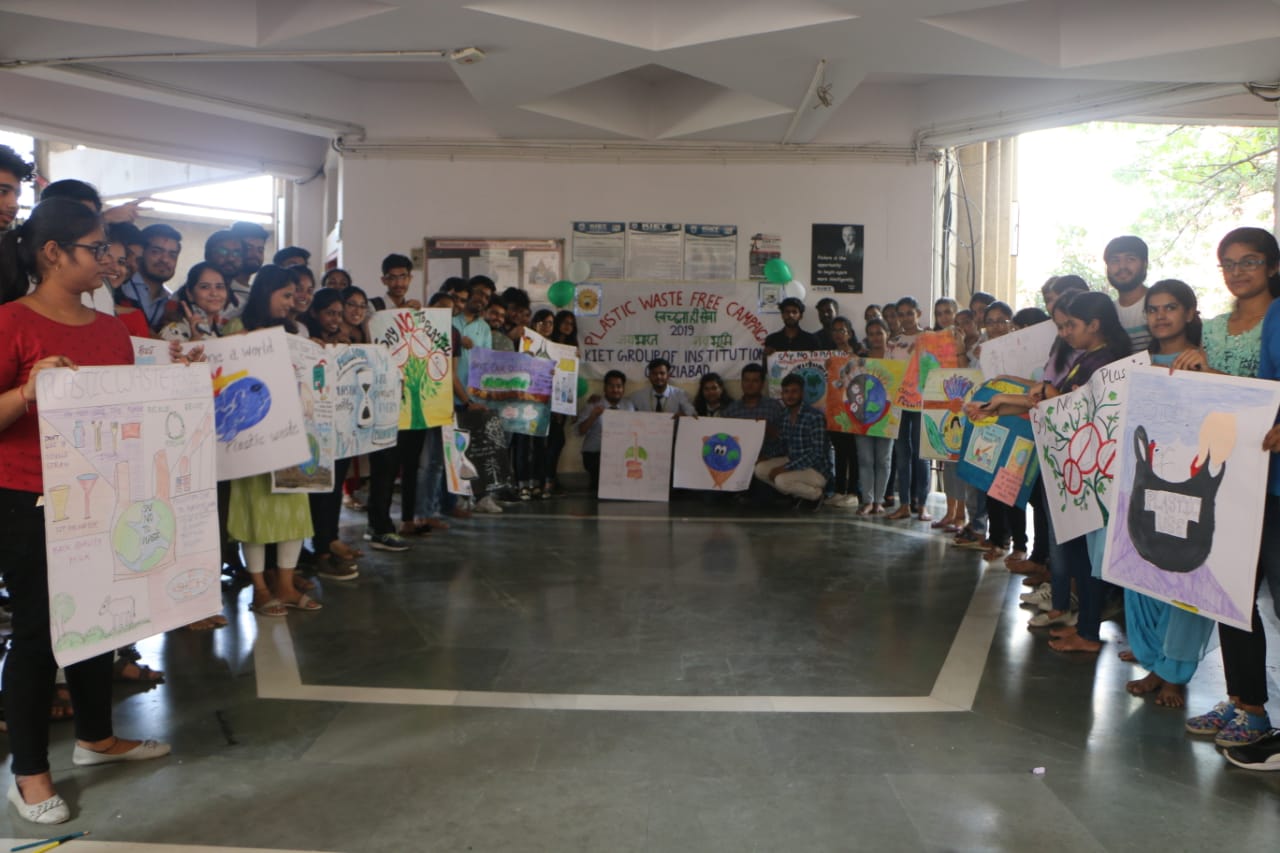 “Sustainable development is impossible without change and those who cannot change their minds cannot change anything”. To bring this paradigm shift, on 27th of September 2019, three events under AICTE "Environmental awareness campaign "Plastic Waste Free Campaign - Swachhta hi Sewa-2019" was organized at KIET. Essay writing competition, poster making competition and nukkad natak performance were included in the awareness campaign. “JAI BHARAT, JAI BHUMI” team organized the event, in which number of students took part for the noble cause to conserve environment. No, of students participated in essay competition to decode their environmental thoughts on paper. Eco friendly hand made cloth banner was an innovative step of the event to stop pollution produced from plastic flex, which got a lot of appreciation. Team “EXPRESSIONS” performed nukkar-natak on plastic impact on the environment and biodiversity and how people are dealing with it at present and what can be done in future to abate plastic pollution.