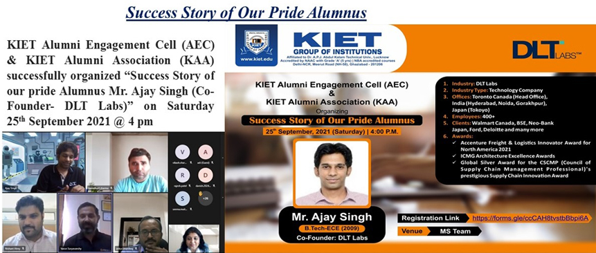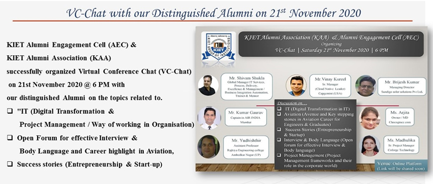 KIET Group of Institutions, Ghaziabad is proud to have a group of about 10,000+ engineers, technologists, pharmacists, entrepreneurs and managers as its alumni. The Institute acknowledges and takes immense pride in the role played by its alumni in the institute’s achievements and advancement.
