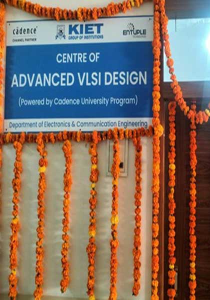 The Centre of Advanced VLSI Design (Powered by Cadence University Program) at KIET Group of Institutions, Ghaziabad is a state-of-the-art facility dedicated to fostering innovation, research, and excellence in Very Large Scale Integration (VLSI) design. The centre has 30 computer system with advanced configuration and is equipped with the Cadence University Research Bundle. The Cadence University Research bundle consists of all the Front-end and Back-end tools required for chip design. The objectives of Centre of Advanced VLSI Design is to bridge the gap between academic learning and industry requirements by providing industry standard EDA tools and training in VLSI design, simulation, verification, and implementation. A Memorandum of Understanding (MoU) is also signed between KIET Group of Institutions & Entuple Technologies Pvt. Ltd. to work together for conducting skill enhancement activities like short term courses/ training cum internship programs and/or career building programs for students on VLSI and allied technologies.