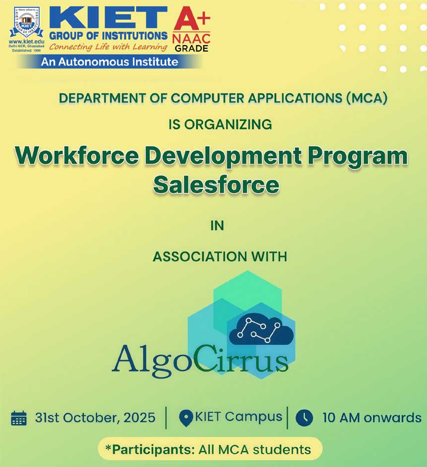 The Department of Computer Applications (MCA), KIET Group of Institutions, is proud to organize a Workforce Development Program on Salesforce, in collaboration with AlgoCirrus on 31-Oct-2025