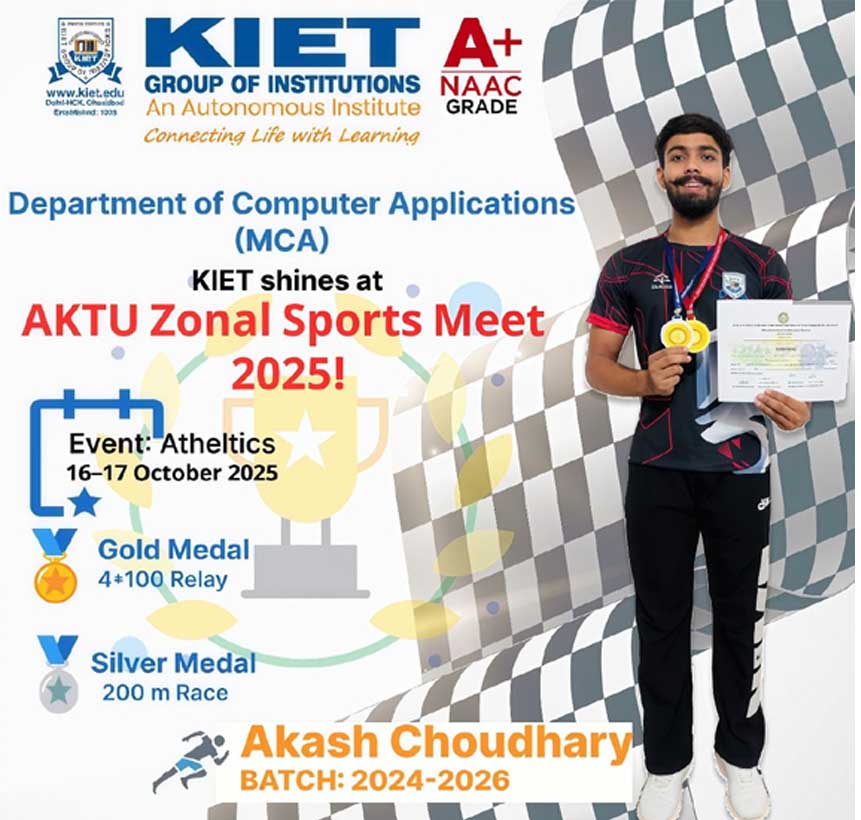 We are proud to announce that our Department of Computer Applications (MCA) student has brought laurels to KIET Group of Institutions at the AKTU Zonal Sports Meet 2025 held on 16–17 October 2025 in the Athletics category.