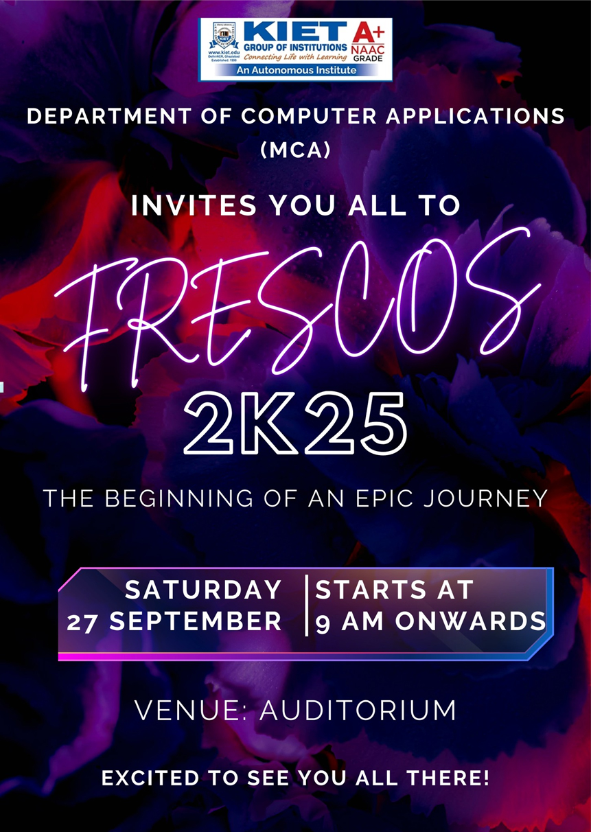 The Department of Computer Applications (MCA), KIET Group of Institutions, is all set to host its fresher’s with the most awaited celebration of the year – FRESCOS 2K25 on 27-09-2025