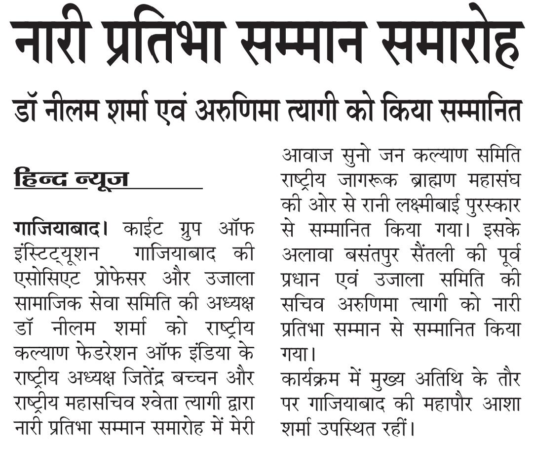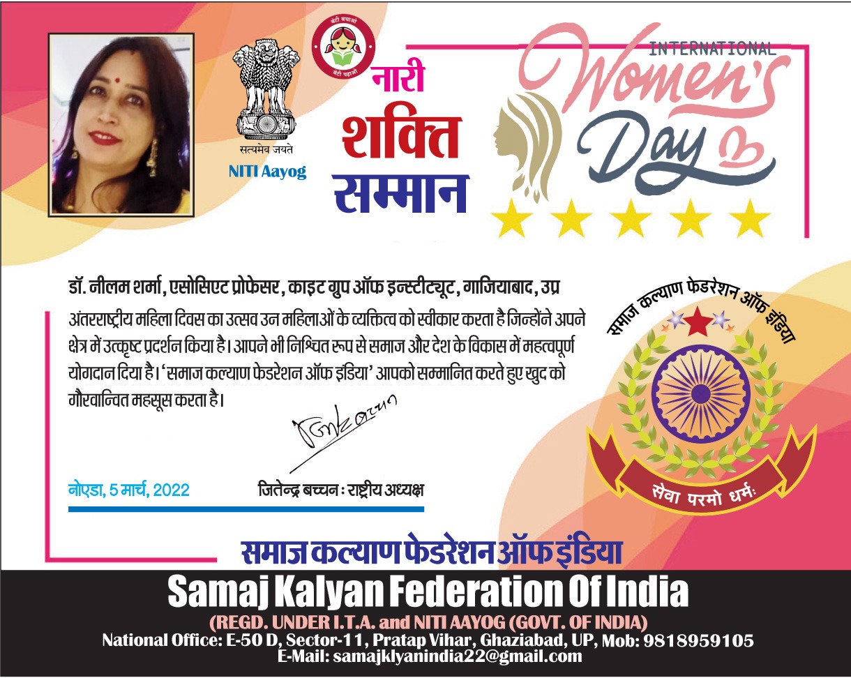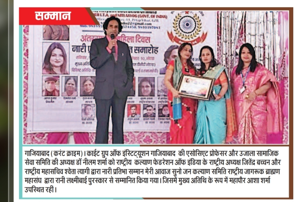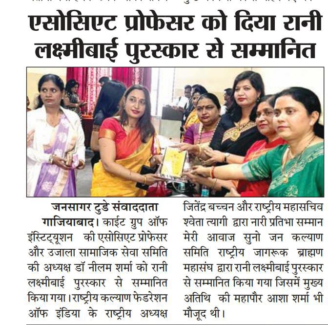 Samaj Kalyan Federation of India honoured "Nari Pratibha Samman" and Meri Aavaj suno jan kalyan samiti honoured "Rani Laxmi Bai" Samman to Dr. Neelam Sharma