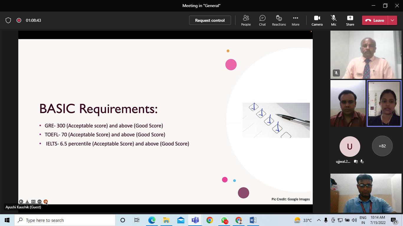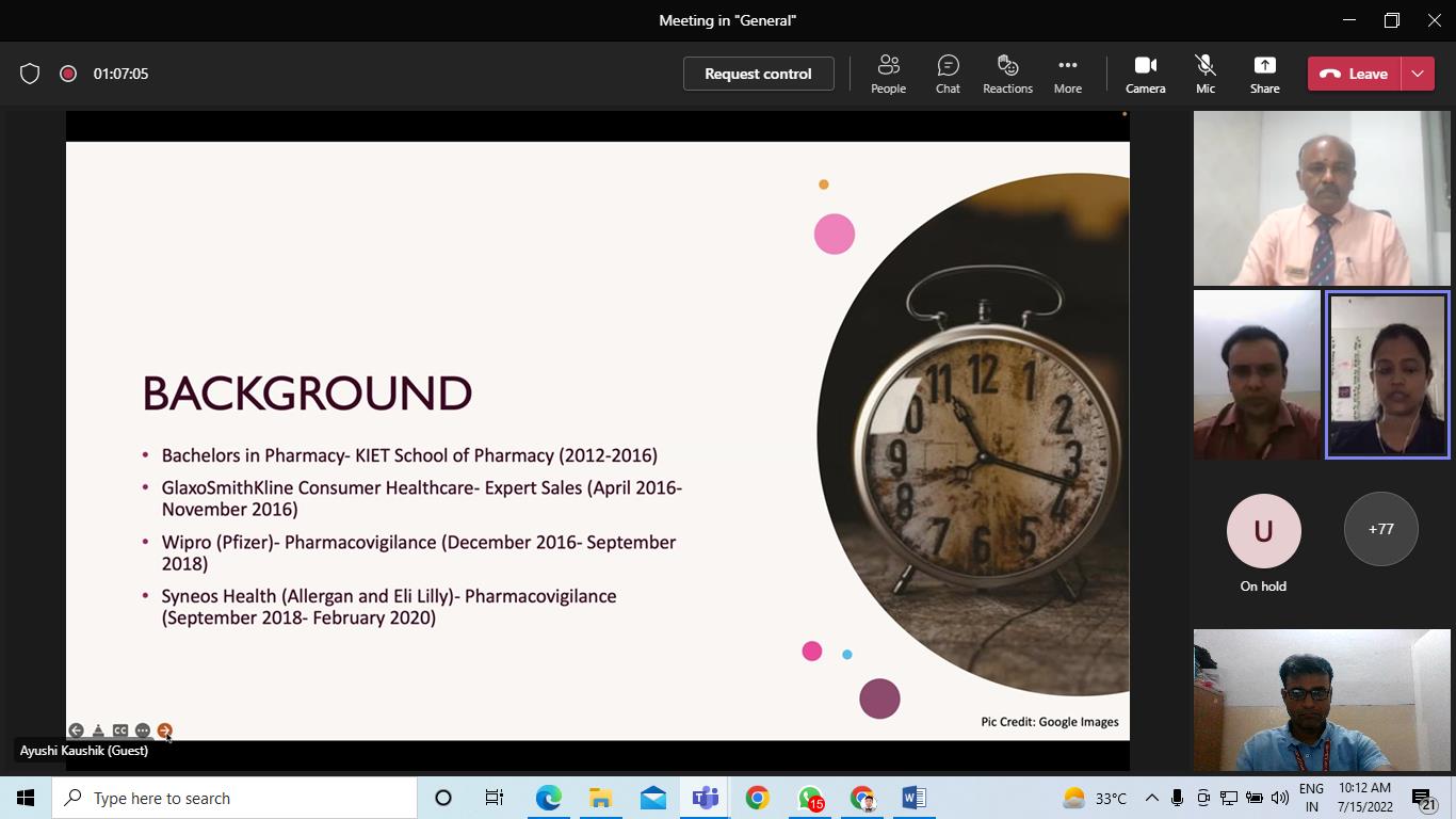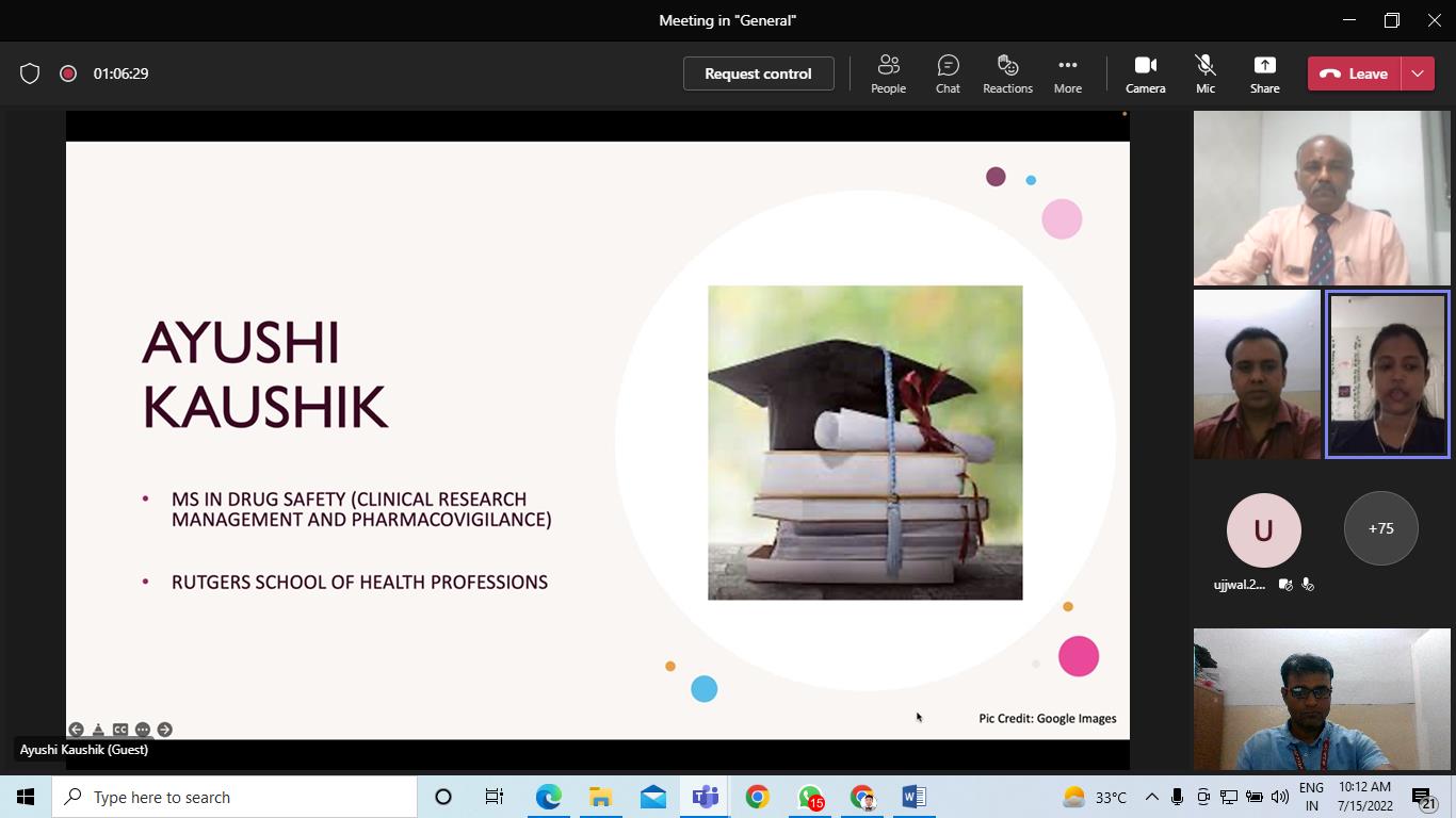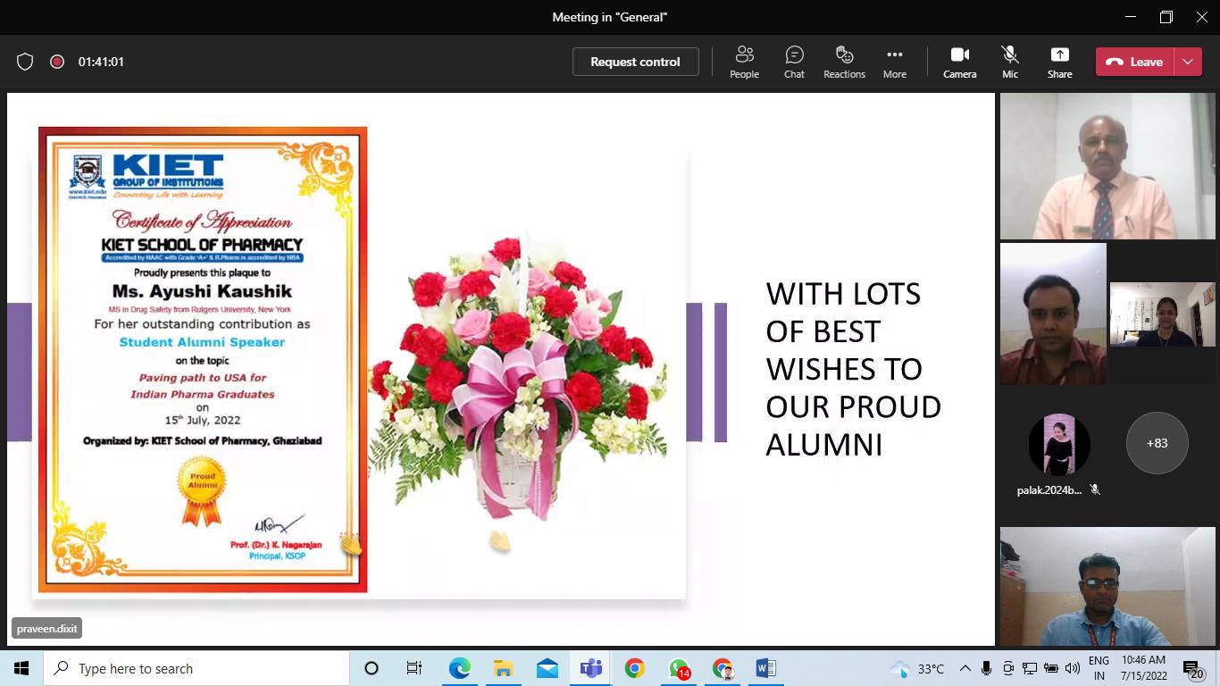KIET School of Pharmacy has organized an Student Alumni Interaction on “Paving path to USA for Indian Pharma Graduates” on 15-July-2022